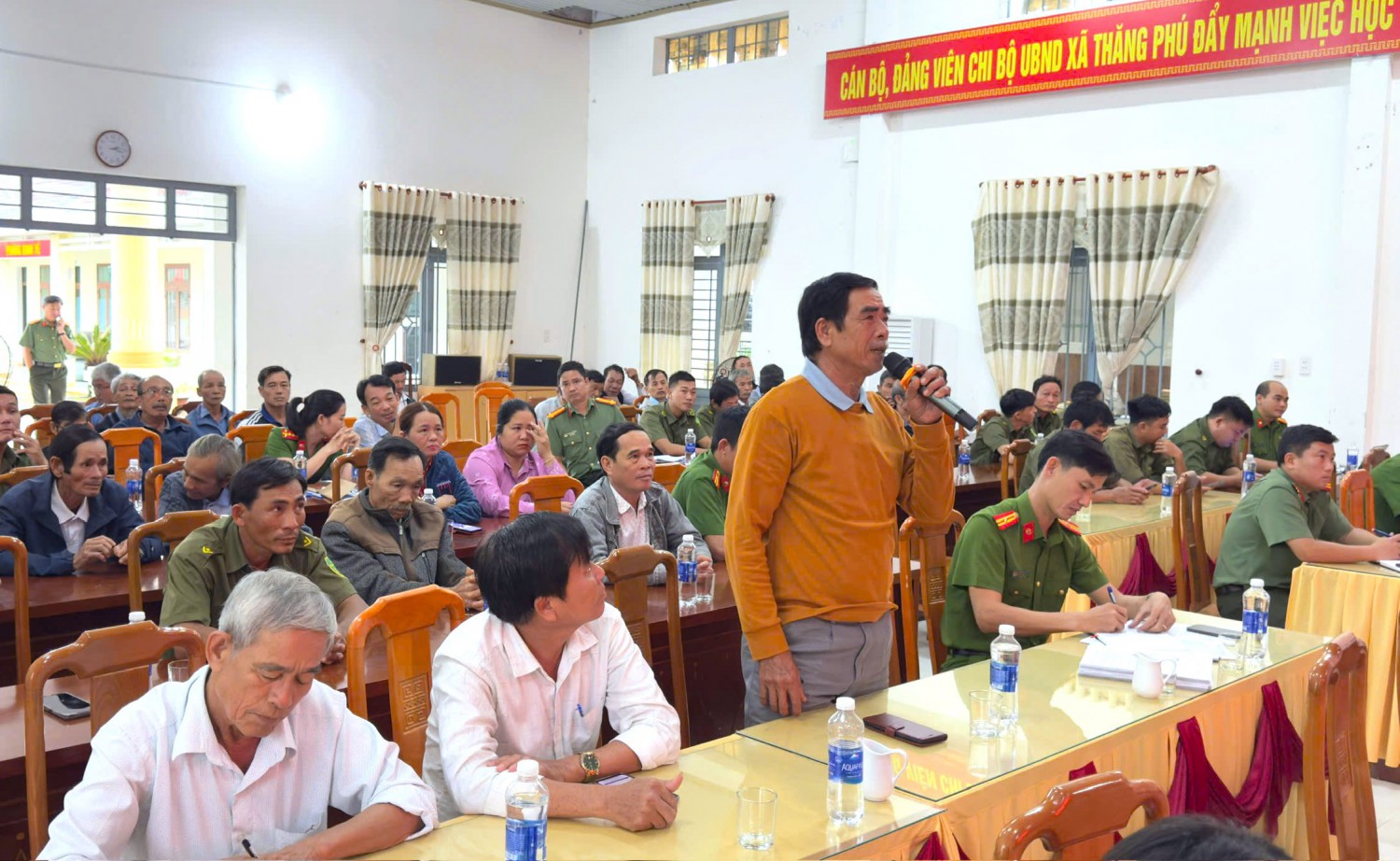 Tại hội nghị, người dân đã nêu 11 ý kiến, kiến nghị tập trung vào các nhóm vấn đề chính về an ninh trật tự như: Công tác quản lý cư trú và cập nhật thông tin dân cư sau khi sắp xếp đơn vị hành chính; Tình trạng thanh thiếu niên tụ tập gây mất trật tự vào ban đêm; Việc tuần tra, kiểm soát tại các tuyến đường liên thôn và khu vực giáp ranh; Lấn chiếm lòng lề đường, họp chợ tự phát gây mất an toàn giao thông;