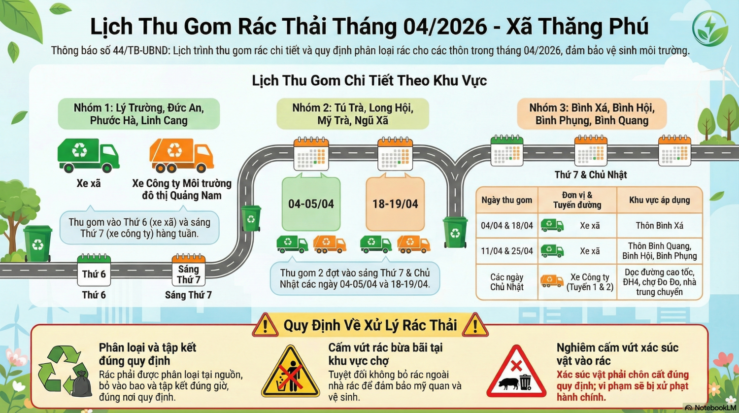 UBND xã Thăng Phú vừa ban hành thông báo lịch thu gom rác thải tháng 4 năm 2026 trên địa bàn xã, nhằm triển khai hiệu quả công tác thu gom, vận chuyển và xử lý chất thải rắn sinh hoạt, góp phần bảo vệ môi trường và nâng cao chất lượng đời sống người dân.