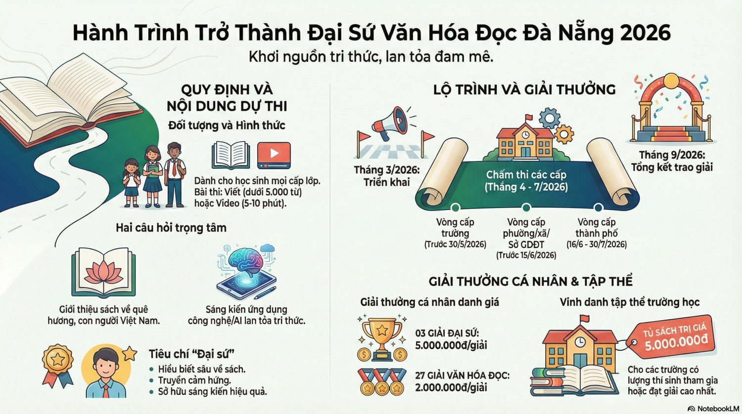 Cuộc thi được triển khai từ tháng 3/2026 đến tháng 9/2026, qua các vòng thi cấp trường, cấp xã/phường, cấp thành phố và tổng kết trao giải dự kiến vào tháng 9/2026 tại Thư viện Đà Nẵng.