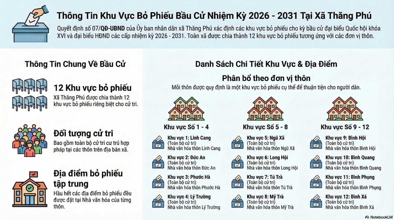 Khu vực bỏ phiếu số 9: Cử tri thôn Bình Hội, bỏ phiếu tại Nhà văn hóa thôn Bình Hội. Khu vực bỏ phiếu số 10: Cử tri thôn Bình Quang, bỏ phiếu tại Nhà văn hóa thôn Bình Quang. Khu vực bỏ phiếu số 11: Cử tri thôn Bình Phụng, bỏ phiếu tại Nhà văn hóa thôn Bình Phụng. Khu vực bỏ phiếu số 12: Cử tri thôn Bình Xá, bỏ phiếu tại Nhà văn hóa thôn Bình Xá. Quyết định có hiệu lực kể từ ngày ký. Các cơ quan, đơn vị liên quan, các tổ chức phụ trách bầu cử và trưởng thôn trên địa bàn xã Thăng Phú có trách nhiệm triển khai thực hiện theo đúng quy định.