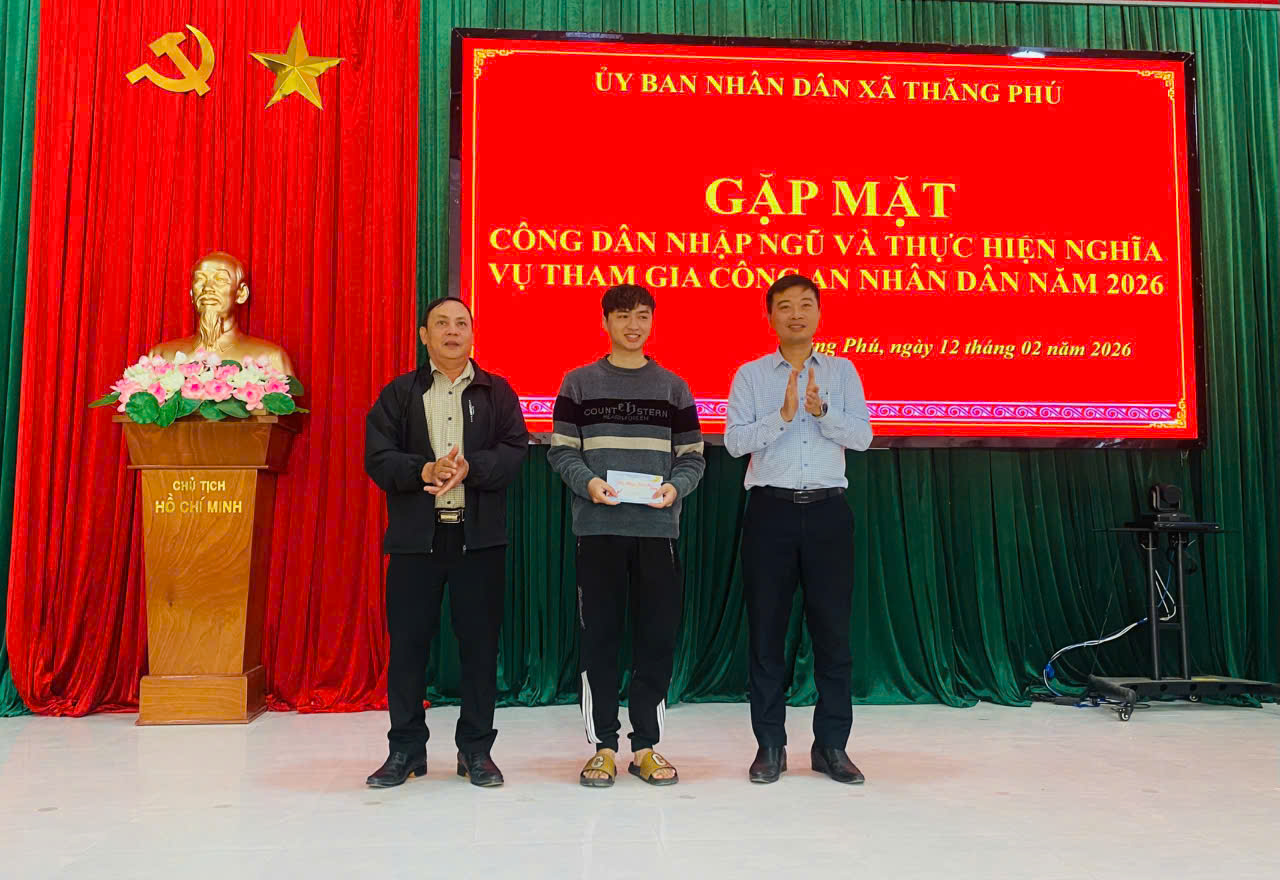 Tại buổi gặp mặt, lãnh đạo địa phương và các ban, ngành, đoàn thể của xã đã trao tặng quà động viên các thanh niên chuẩn bị thực hiện nghĩa vụ quân sự, nghĩa vụ Công an nhân dân năm 2026.