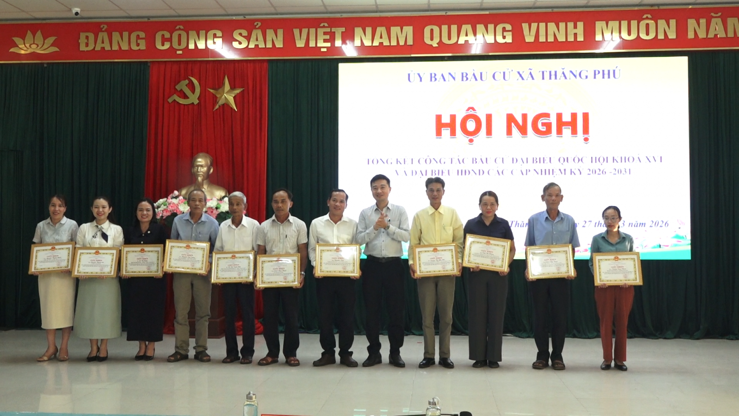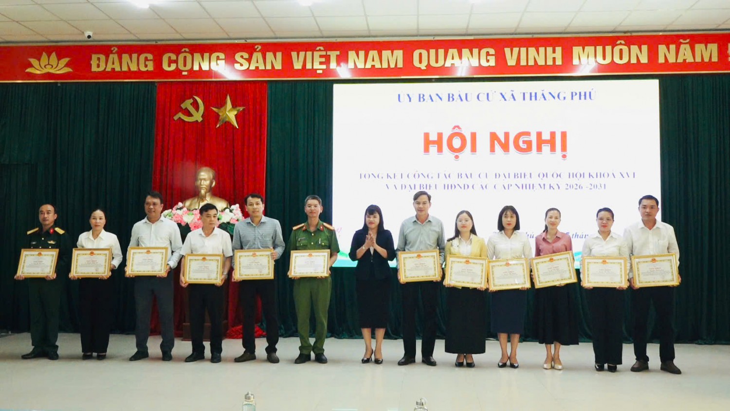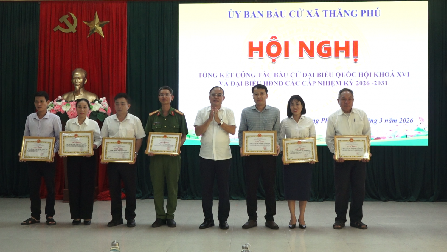 Tại hội nghị, UBND xã đã khen thưởng cho 7 tập thể và 28 cá nhân có thành tích tiêu biểu trong công tác bầu cử đại biểu Quốc hội khóa XVI và đại biểu Hội đồng nhân dân các cấp nhiệm kỳ 2026 – 2031.